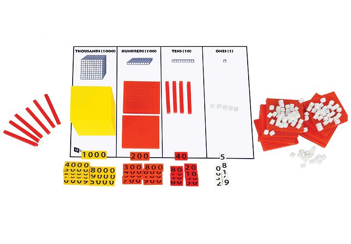 Includes one yellow decimeter cube (1000 piece), 10 orange flats (100 piece), 10 red rods (10 piece) & 100 white non-linking unit cubes (1 piece) and 37 piece set of place value tiles all packaged in a reusable bucket.