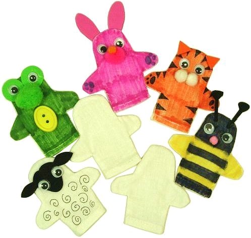 Pack of 20 plain white cotton finger puppets that can be coloured with felt tip pens, fabric pens, and decorated with craft materials. Each puppet measures approx 6cm x 3cm.