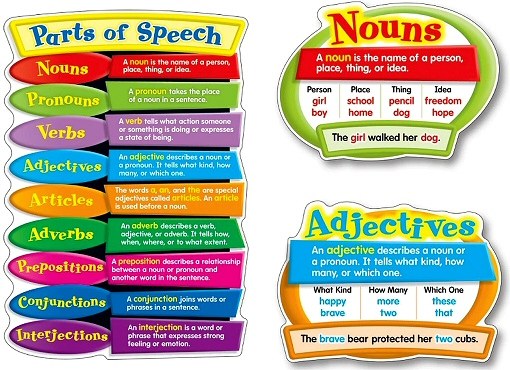 "Perfect for writing centers and learning stations, the Parts of Speech bulletin board set serves as a helpful reminder to students.